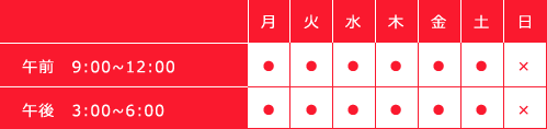 ◎土曜日のみ午後2:00~5:00 ※往診・在宅応需 / 休診日 日曜日・祝祭日